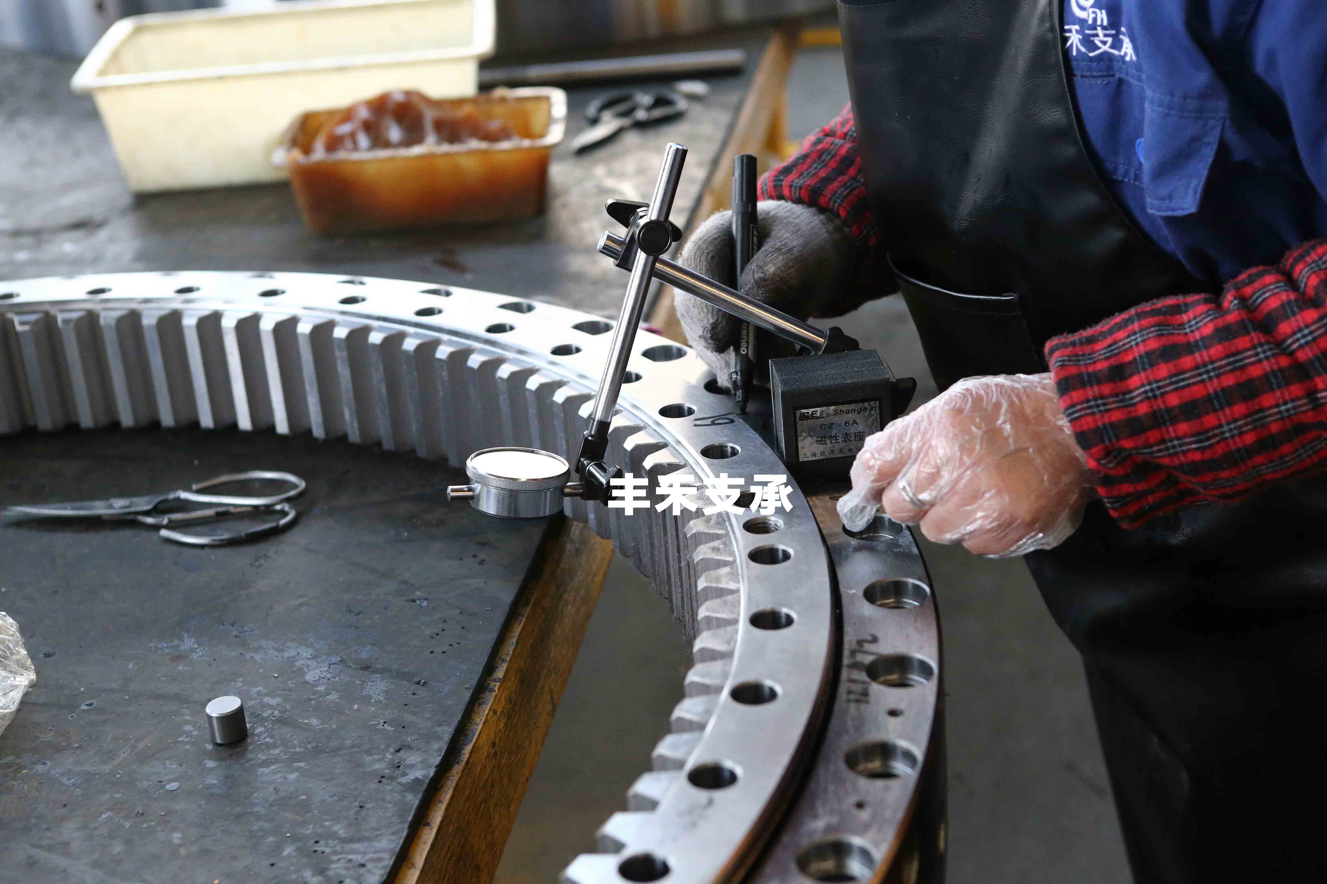 ?將初始點(diǎn)處的百分表指示器連接到一個(gè)齒圈的外部,或盡可能靠近,以便記錄回轉(zhuǎn)支承圈之間的相對(duì)軸向運(yùn)動(dòng)。千分表的精度必須為0.001“或更精細(xì)。